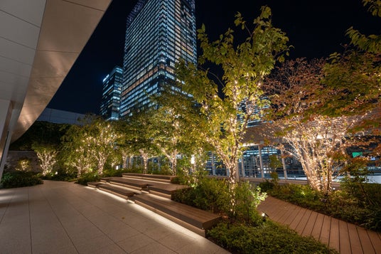 5F YAESU TERRACE では、シャンパンゴールドのイルミネーションで樹木を彩る「Illumination TERRACE」が東京駅の夜景とともに幻想的な空間を演出します。見る角度によって光の輝き方が変わる集光型のLEDライトを採用することで、テラスを歩きながら様々な表情をお楽しみいただけます。