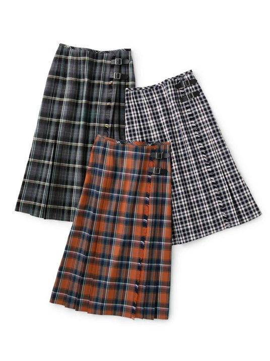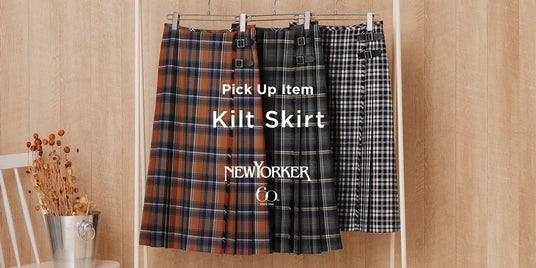 スコットランドの伝統的な衣装「キルト」が由来である、キルトスカート。“タータン柄”の布を腰に巻く“巻きスカート型”に、随所に施した動きのある“プリーツ”や前面を固定する“革ベルト”が特徴です。端正な面持ちのキルトスカートは時代を超えて世界中で愛されるトラッドアイテムになりました。ニューヨーカーでは24年秋冬新作アイテムとして、今季一押しテーマカラーをイメージソースしたチェックが特徴の「マジックアワーチェック」、雪のように繊細で柔らかなループ糸で表現した「SNOWニューヨーカータータン」の2型をご用意。
