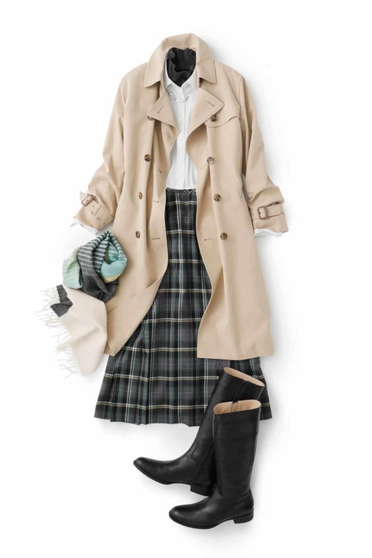 トラッドアイテムで揃えるなら、やっぱりトレンチコート一択!ハリのあるシャツにグレーのハイネックカットソーをほんの少しのぞかせたクールな着こなしもお手の物。スカートの配色に合わせたマフラーにロングブーツを合わせると、都会的なトラッドコーデに。