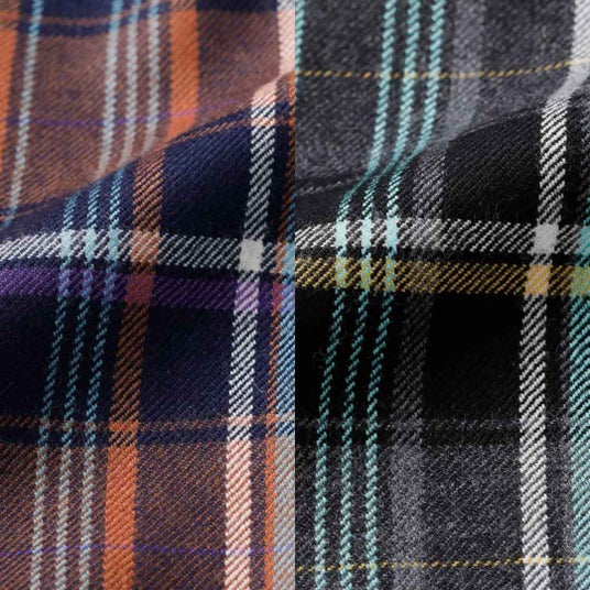 「マジックアワーチェック」多彩なカラーで組み合わされたウール100%のチェック柄の生地。オレンジは今シーズンのテーマであるマジックアワーを表現しています。「SNOWニューヨーカータータン」ニューヨーカータータンの冬素材である、ループ糸を使用した特別な生地。雪のように繊細で柔らかなニューヨーカータータンを愉しめます。
