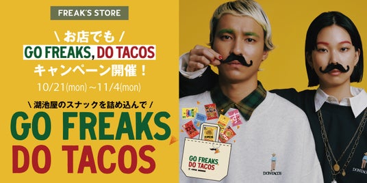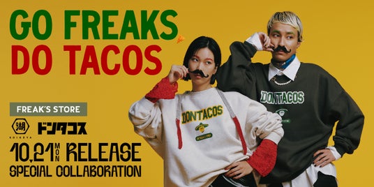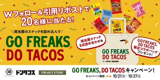 株式会社デイトナ・インターナショナル(本社 : 東京都渋谷区 / 代表取締役社長執行役員CEO 佐々木 聡〈ささき あきら〉)が運営するセレクトショップ【FREAK’S STORE(フリークス ストア)】は、今年で発売30周年を迎えた株式会社湖池屋(社長:佐藤章)の“ドンタコス”とのワクワクするような夢のコラボレーション企画を実現しました。陽気で楽しい“ドンタコス”をデザインに落とし込んだコラボアイテムの発売や、湖池屋のスナックを詰め込んだ「GO FREAKS, DO TACOS バッグ」がもらえる3つのキャンペーンを10月21日(月)よりスタートします。