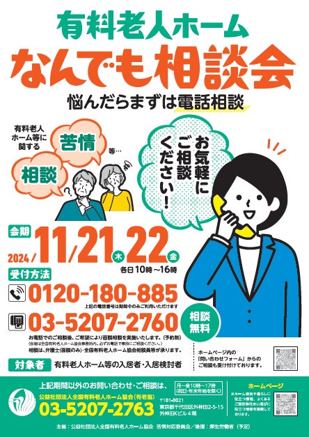 公益社団法人全国有料老人ホーム協会(理事長:中澤 俊勝、所在地:東京都千代田区)では、11月21日(木)~11月22日(金)の2日間、「有料老人ホームなんでも相談会~悩んだらまずは電話相談~」(後援:厚生労働省)を、当協会「苦情対応委員会」のもと有料老人ホーム等の入居者および入居希望者からの相談・苦情等を受ける目的で開催いたします。