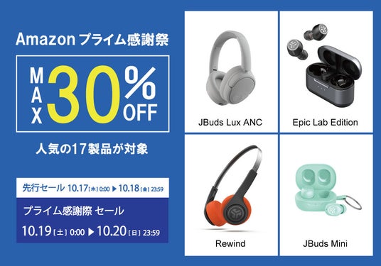 2023年度にスポーツイヤホンとキッズヘッドホンのカテゴリーで全米売上No.1(※1)を獲得した「JLab」の日本法人、JLab Japan株式会社(本社:東京都港区、代表取締役:横張 亮輔)は、2024年10月19日(土)0:00 ~ 2024年10月20日(日)23:59 まで開催される「Amazonプライム感謝祭」において、人気の完全ワイヤレスイヤホン・ヘッドホン等、17製品を最大30%OFFにて販売いたします。