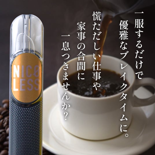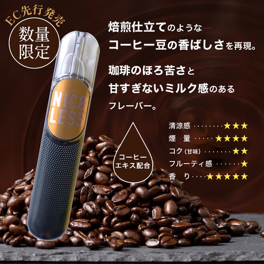 この度はNICOLESS VAPEシリーズでさらに多くのフレーバーをお楽しみいただくべく、新たに珈琲フレーバーを発売します。本フレーバーでは、焙煎仕立てのようなコーヒー豆の香ばしさを再現しました。コーヒーエキスを配合し、珈琲のほろ苦さと甘すぎないミルク感が特徴です。