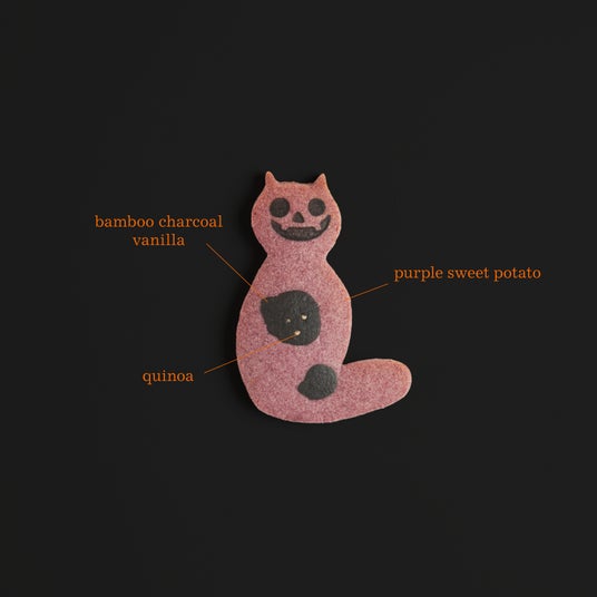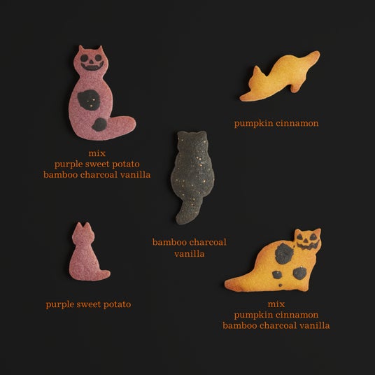 黄猫(パンプキンシナモン)、紫猫(紫芋)、黒猫(竹炭バニラ)、ぶち猫(パンプキンシナモン&竹炭バニラ、紫芋&竹炭バニラ)