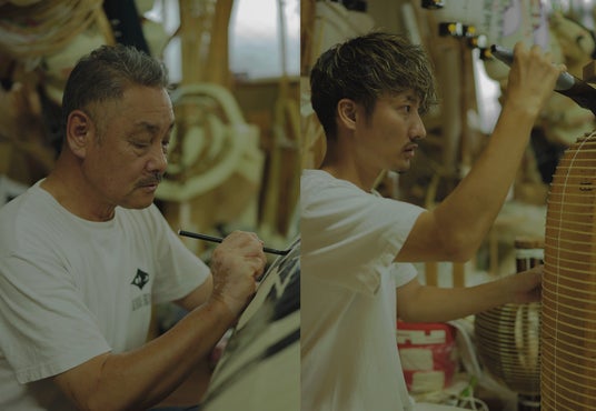 200 年以上の歴史を持つ小嶋商店は、伝統製法の元、新たな可能性を追求している職人集団。10代目の諒さんが紙張りを行い、そして9代目の護さんが絵付けを行います。TASTING ROOM のシンボルとも言える提灯はエネルギーに満ち溢れ、全てのお客様を温かく迎えてくれます。