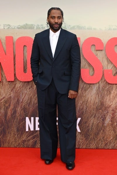 ジョン・デヴィド・ワシントンは、メンズ コレクションからネイビーウールのピークドラペルスーツとクラシックなホワイトのコットンシャツに、ブラックのレザーブーツを合わせました。