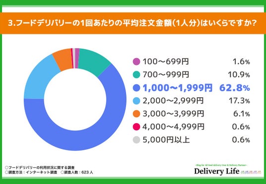 フードデリバリー1回の平均使用金額、「1,000~1,999円」が62.8%で最多