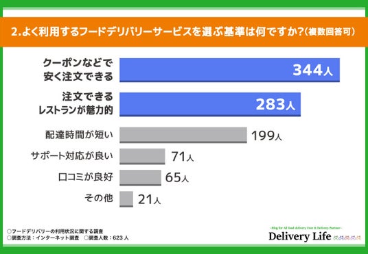 消費者がサービスを選ぶ際の基準としては「クーポンなどで安く注文できること」や「注文できるレストランの魅力」が重視されており、価格の安さと店舗の質が重要な決定要因になっていることがわかりました。