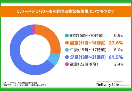 と、多くの利用者がフードデリバリーを「18時以降」に利用していることが明らかになりました。特に、全体の61.5%が18時~21時の間に注文しており、夕食の際にフードデリバリーを活用する傾向が高いことがわかります。