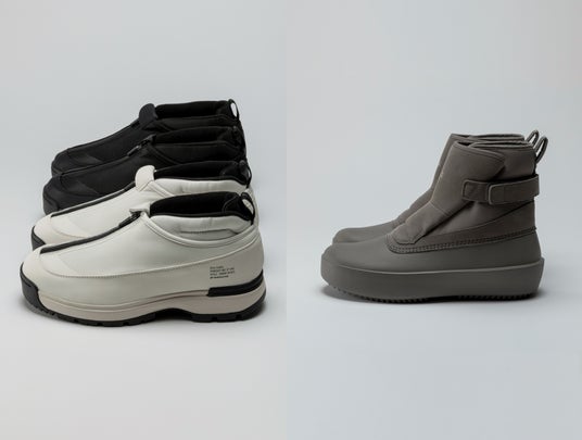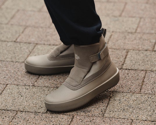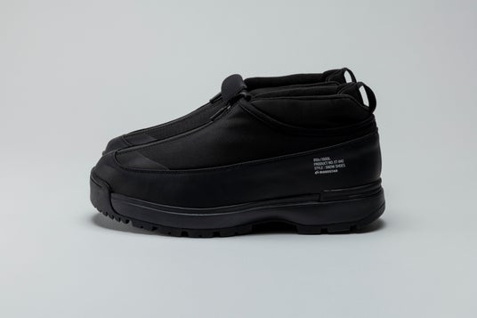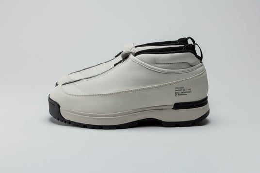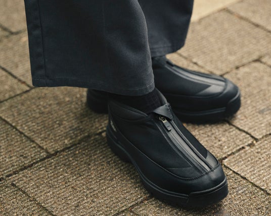 雪寒地用シューズの製造ノウハウをデイリーユースに。アウトソールには、氷上でも滑らないシロクマの足裏からヒントを得たガラス繊維配合ラバーを搭載し優れたグリップ力を発揮。ア ッパーは、着脱しやすいジッパーを搭載しながら、撥水加工を施したマテリアルで甲周りを覆った防水設計。氷上活動で必要な要素をシックな佇まいに整えたブーティタイプ。