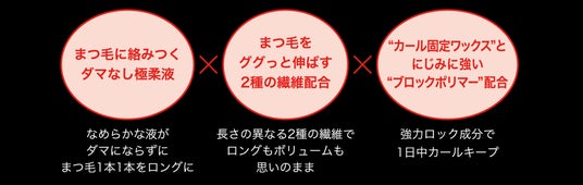この商品の一番の特長は、‟ロング・ボリューム・カールキープ”全てを兼ね備え、ダマなく爆発級*に美しいまつ毛に仕上がること。なめらかな液がダマにならずに、まつ毛を1本1本長くしボリュームアップ。さらに、強力ロック成分でまつ毛を1日中カールキープし、インパクトのある目もとに仕上がります。