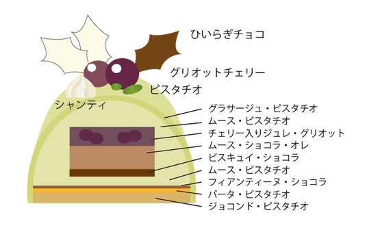 9層ものレイヤードが美しい、なめらかな舌触りのピスタチオ好きにはたまらないムースケーキ。ジョコンド(生地)にムースとペーストを足して、上質なピスタチオの風味に奥行きを出しました。優しい味わいに、ガーナ産カカオを使ったミルクチョコレートのコクや、シロップ漬けのグリオットチェリーの甘酸っぱさが変化をもたらします。柊を模ったチョコレートがアクセントの、お洒落なピスタチオカラーのブッシュ・ド・ノエルは、シャンパーニュやワインなどお酒との相性も良い大人向けのケーキです。
