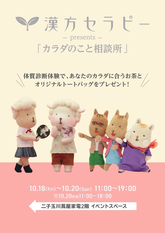 今回は、更年期世代の方を対象に「更年期症状にも漢方が有用であること」をお伝えするため、10月18日の世界メノポーズデーに合わせて「漢方セラピーpresents『カラダのこと相談所』」を開催します。イベントでは、当社の診断コンテンツ「からだかがみ」を通して、東洋医学の視点から更年期と上手く向き合っていくための気づきが得られる内容や、体質に合ったお茶の試飲をご用意しております。