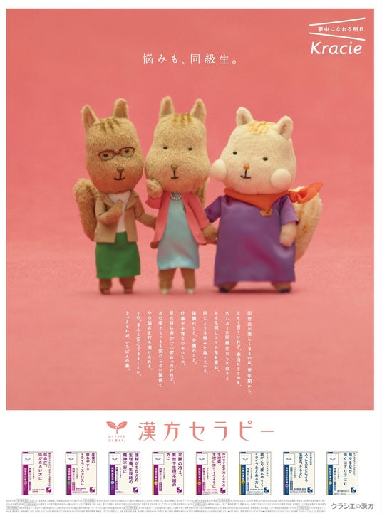 「世界メノポーズデー」当日に、日本経済新聞朝刊にて漢方セラピーの新聞広告を掲載します。CMで話題となった更年期世代のシマリス仲良し3人組が「悩みも、同級生」という更年期世代に向けた共感のメッセージと共に登場します。また、漢方セラピーシリーズから提供している更年期や月経関連といった女性特有のお悩みを改善する8処方も紹介します。