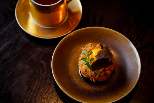 メインディッシュのような佇まいのクロケットは、近江牛を100%使用した贅沢な一皿。溢れる肉汁と揚げたてのクリスピーな衣、卵黄のコンフィに濃厚な赤ワインソースが絡み合い、絶妙な美味しさを堪能いただけます。ペアリングには燻製の香りをまとったユニークなほうじ茶が味わいに深みを与え、クロケットの油分をすっきりとリセットします。