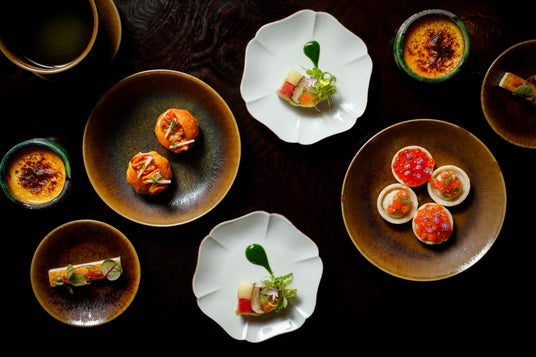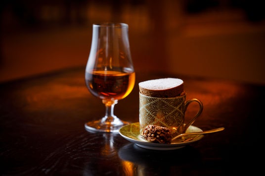 コースの最後は、まろやかな口当たりとチョコレートの優しい甘さがじっくりと広がる寒い冬にぴったりのスフレをご用意いたします。温かく解けてなくなるような口当たりで、コースの最後にほっと一息をつける穏やかな気分へと誘います。カカオシェルをブレンドした和紅茶のペアリングで、同じフレーバーが重なり、フェスティブらしい甘く華やかな香りの余韻を残します。