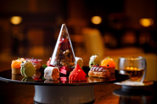 柔らかな黄金色の光を取り込む幻想的なミラーのティースタンドで、プレゼンテーションにもこだわった彩り豊かな全5種類のスイーツをお届けいたします。なかでも注目の一品は、山崎蒸留所の梅酒とラム酒にじっくりと漬け込んだ5種類のドライフルーツをふんだんに練りこんだ、ホテルオリジナルの“シュトーレン”です。上品な甘さとフルーツの芳醇な香りが絶妙に調和し、心温まる味わいをお楽しみいただける毎年好評のフェスティブスイーツです。ペアリングには、ハーブのアロマに柚子の優しい甘みを重ねたハーブティーをご用意。それぞれのスイーツの美味しさを優しく引き立てる洗練されたペアリング体験をお楽しみいただけます。