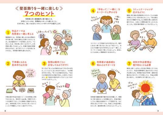 ちぎる、折る、丸める、塗るなど、手先を使う壁面飾り制作は、脳トレやリハビリにも役立つので、ぜひ積極的に参加してほしいもの。巻頭の「壁面飾りを一緒に楽しむ7つのヒント」では、利用者さんとのコミュニケーションが広がる準備や説明のしかたを解説。本編でも、利用者さんが達成感が得られる工夫を満載しています。