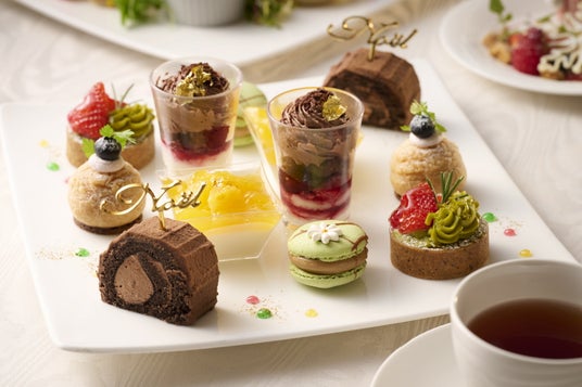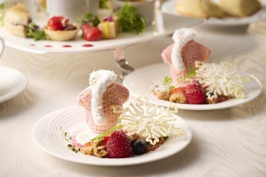 「クリスマスアフタヌーンティー」は、アールグレイの風味豊かなマカロンや、濃厚なピスタチオに、イチゴの甘さと酸味が絶妙にマッチしたタルトなどがスタンドを彩ります。フランス語で「黒い森」を意味するフォレ・ノワールは、チョコレートクリームとさくらんぼのコンフィ、サクサク食感のクランブルを合わせてグラスデザートに仕上げました。セイボリーには人参の優しい甘さが広がるキャロットブリュレや、プレゼントをイメージしたサーモンのパイ包み焼きをご用意。クリスマスリースを連想させる華やかな盛り付けがクリスマス気分を一層引き立てます。