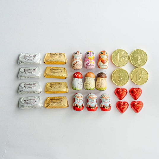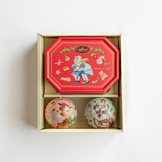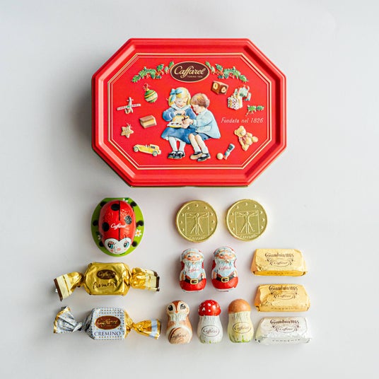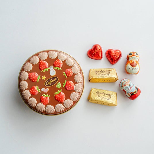 内容:おめかしした女の子と男の子がチョコレートを分け合うほほえましいクリスマスのワンシーンがデザインされた蝶番缶。カファレルの代名詞であるジャンドゥーヤや人気のピエモンテに加え、抹茶フレーバージャンドゥーヤのリス、サンタクロースやきのこ、テントウムシのホイルチョコレート、ユーロコイン型チョコレートなど全13粒のチョコレートがアソートされています