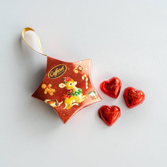 内容:お星さまの形をしたオーナメントに、様々なクリスマススイーツとクリスマス仕様の小鹿がデザインされています。ハートのホイルチョコレートが全3粒。ペーパー素材で軽いため、チョコレートを食べ終わった後はツリーのオーナメントとしても気軽にお使いいただけます