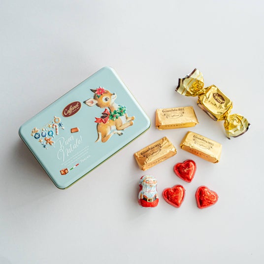 内容:クリスマスリースを胸に、ポインセチアを頭に飾った小鹿が描かれた中缶。カファレルの代名詞であるジャンドゥーヤをはじめ、人気のピエモンテに加え、サンタクロースやハートのホイルチョコレートなど全8粒のチョコレートがアソートされています