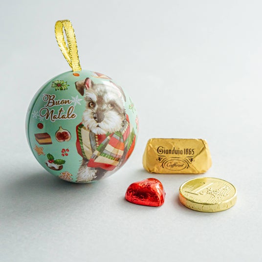 内容:クリスマスのプチギフトにもおすすめの蝶番缶です。プレゼントボックスとおめかしした子犬がポイントのデザインが目を惹きます。蓋はエンボス加工されており、高級感もあります。サンタクロースのホイルチョコレート、ジャンドゥーヤ、ハートとユーロコイン型の全5粒のチョコレートがアソートされています