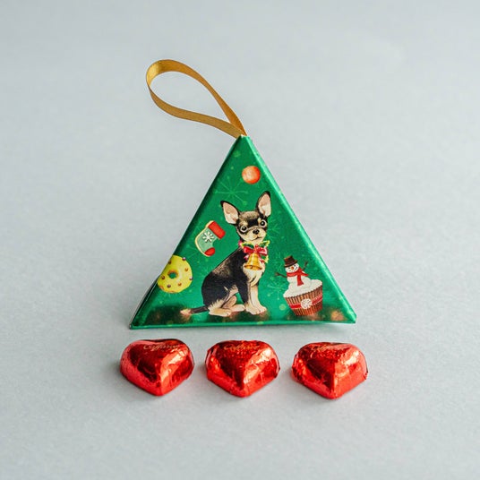 内容:クリスマスツリーをイメージしたオーナメント。クリスマス仕様のチワワを中心に、様々なクリスマススイーツが賑やかなクリスマスを演出しています。ハートのホイルチョコレートが全3粒。クリスマスツリーのオーナメントとしてはもちろん、窓枠に吊るしても可愛い飾りになります。