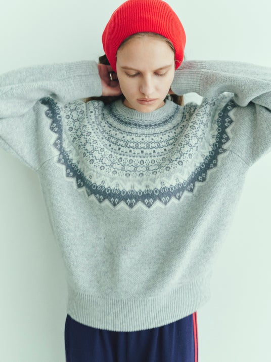 肌触りがよく滑らかなタッチで、伝統的なノルディックのほっこりとした雰囲気の中にフォーマルな気品が宿るニットをカラー別注しました。冬空に映えるネイビー、優しく清らかなグレーと温かみのあるナチュラルなベージュの3色展開で登場します。カジュアルにデニムやワークパンツと合わせるのはもちろん、ブランドらしいウールパンツとのスタイリングもおすすめです。本アイテムはメンズサイズも展開いたします。