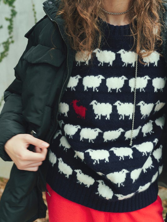 ブランドが24FWコレクションで展開する、ダイアナ元妃が40年ほど前に愛用していた羊モチーフのニットをオマージュしたアイテム。ブランドではメンズサイズのみでリリースされる本アイテムを特別にレディースサイズで別注しました。素材はウール素材をメインに起用し、羊に紛れているバイカラーのヤギ2匹をカシミヤで仕上げるというブランドらしい遊び心の詰まったアイテムです。ブランドが展開しているグリーンに加え、RHC ロンハーマンらしいカジュアルなスタイリングに映えるネイビーをカラー別注しました。