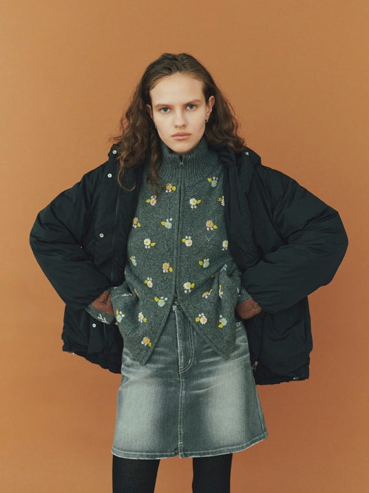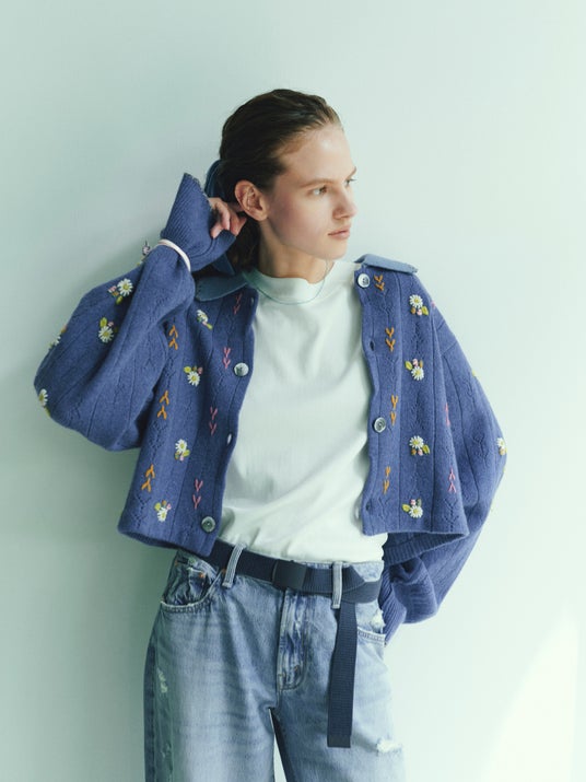 ブランドで定評のあるハンドメイドのデイジーフラワーが女心をくすぐる愛らしいカーディガンとボレロをロマンチックなブルーとライトブルーでそれぞれカラー別注しました。ボタンを留めてトップスとしても、羽織としても重宝するカーディガンは、シンプルにデニムやオーバーオールと合わせるだけで、気分も華やぐコーディネートが完成します。
