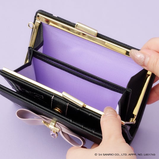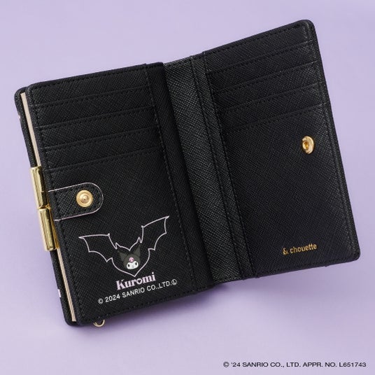 折財布の小銭入れ部分はがま口タイプで、開け閉めが便利な仕様。開けた内側には「クロミ」のアートが。
