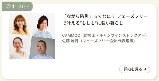 仕事をしながら、子育てをしながら、暮らしを整えながら、ラクをしながら、楽しみながら防災も叶える――。そんなライフスタイルを著書にまとめたCAMMOCのマミ・カナ・アヤの3人が、フェーズフリー協会の佐藤代表と、これからの時代の暮らし方を考えます。