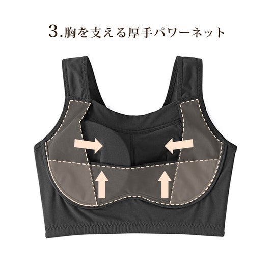 上部から胸が流れないように前身ごろを長くし、上辺は胸元にフィットする仕様にしております。また、重たいバストを肩だけで支えず、背中全体で支えられるように背中部分が広く設計されております。ボリュームのあるバストをしっかりと支えるため、バージスラインの脇側と下側に2重のパワーネットパネルを付けました。
