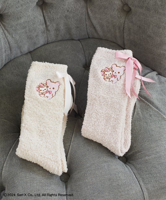 また、「リラックマ」コラボ初のルームソックスや、日本製のタオルハンカチにはそれぞれコラボアートを刺繍し、リボンをプラス。そのほか、定番のダブルリボントートバッグや、バッグチャーム、ぬいぐるみなどもご用意しました。