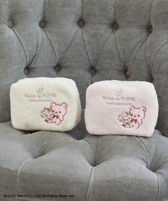 中でも注目アイテムは、ぬいぐるみをイメージしたもこもこのボア素材にコラボアートを刺繍したボアトートバッグと、ボアポーチです。「コリラックマ」の刺繍に重ね付けした立体的なオーガンジーのリボンがポイント。コラボアートをモチーフにした「コリラックマ」と、「くまのぬいぐるみ」のフェイスポーチは、引手部分を「ボタン」と「しっぽ」にするなど細部のディテールにもこだわりました。