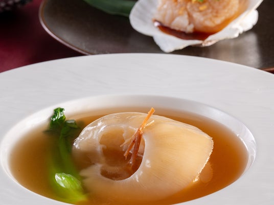 ◇メニュー例:ふかひれ姿煮込み(上湯 または 白湯スープ)、ホタテ貝柱のガーリックバター蒸し 香り醬油 など全8品のコース