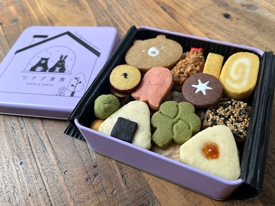 「ツナグ茶房」のマスコットキャラクターが際立つ秋のお弁当を表現したサブレ缶は、家族や友人への差し入れにも最適。