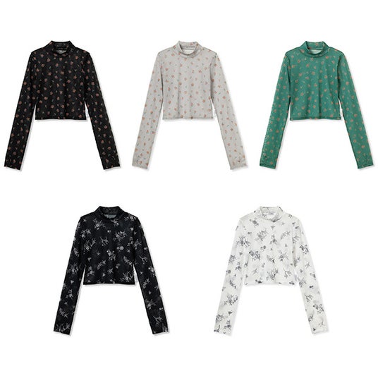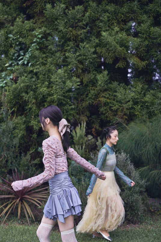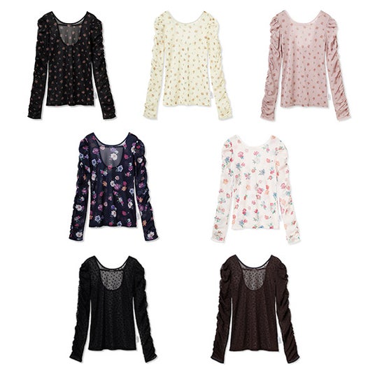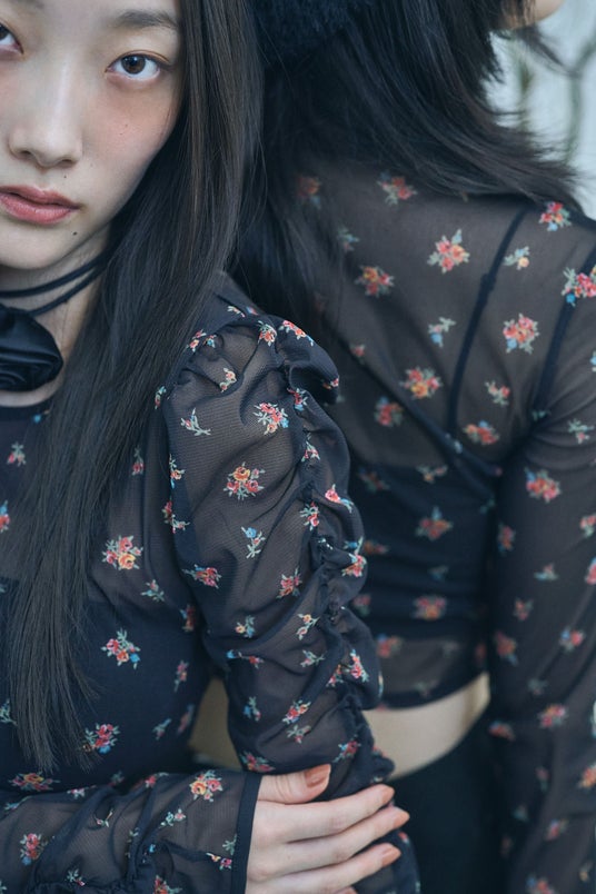 中でもアイコニックなアイテムとなる「シアートップス」は、KEITA MARUYAMAのアーカイブから優美なフラワープリントをUSAGI ONLINEらしいフェミニンなディテールとカラーで表現し、シーズンレスで、その時々のスタイリングを美しく引き立てる一枚に仕上げました。