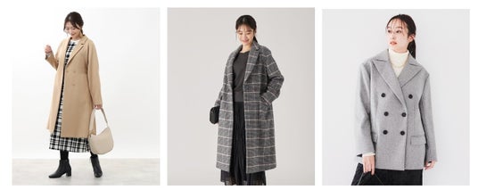左:「リフレクト」クラシカルロングコート ¥83,930 中央:「クード シャンス」チェスター風コート ¥59,400 右:「アンタイトル」ウールメルトン ピーコート ¥55,000 (全て税込み)