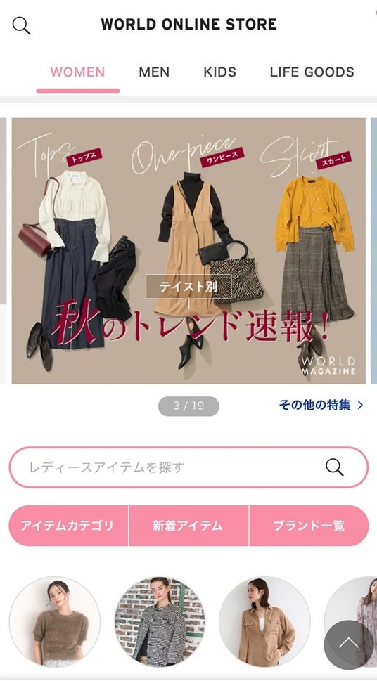 ワールドグループの多彩なブランドに加えて、ファッションECサイトのプラットフォームとして他社商品も取り扱い、レディース、メンズ、キッズ、ファッション雑貨、ライフスタイルグッズまで、ひとつの企業の公式サイトとしては群を抜いた商品展開が強みです。会員基盤「ワールド プレミアムクラブ」と、全国およそ2,000を超える店頭と連動して、商品の新着情報やキャンペーン情報もいち早くキャッチいただけます。更に、店頭スタッフの着こなしを伝える「スタイルスナップ」から商品詳細を見たり店舗詳細で個別ドレッサーにもアクセス。お客様はご自身のテイストに合わせて、またいつもの店舗のドレッサーの着こなしを身近にご覧いただけます。