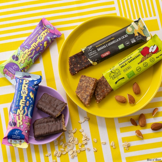 イタリア初のローチョコレートブランド「カカオクルード」から、プラントベースのプロテインバーが登場。オーツミルクローチョコレートでコーティングしました。(写真左)