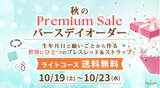 生年月日とお願いごと、石のサイズやデザインがオンラインでお選びいただける、必要な要素がギュッと詰まったライトコースが送料無料のプレミアムセールを行います。大切な方へのお守りへもピッタリです。