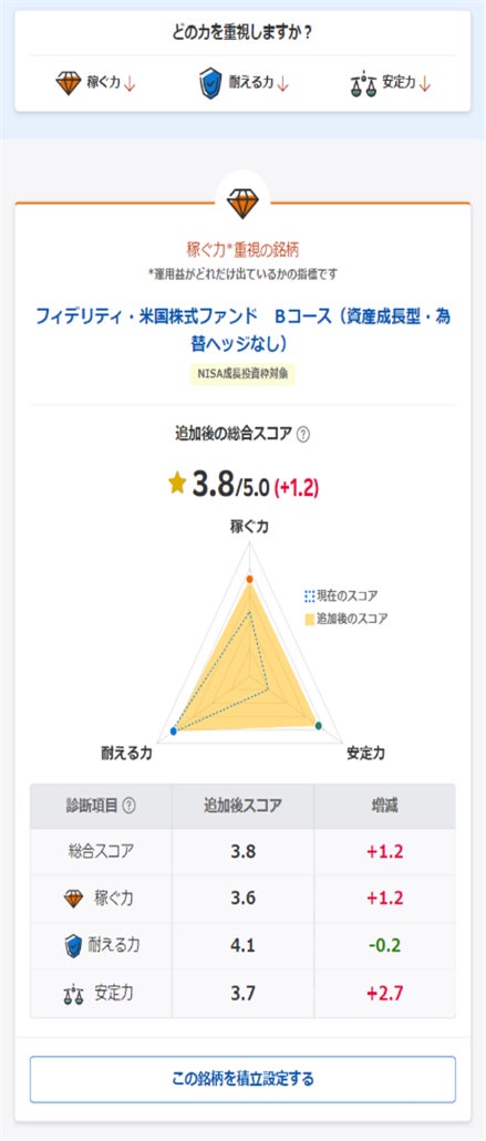 – 「安定力」:現在の積立設定が、複数の投資信託を組み合わせることで、安定した値動きをどれだけもたらしているか数値化したスコアです。積立設定が1銘柄の場合、スコアは1.0になります。銘柄を複数組み合わせることで、どれだけ値動きの幅を抑えて安定させられるかの指標となります。