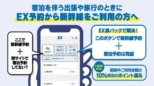 昨年10月にスタートした「EX旅パック」は、スマホから列車や宿泊手配、チケットレス乗車や列車変更ができる“新しい旅行商品”として好評いただいています。このたび、「EX旅パック」をご利用の方を対象に、WESTERポイントを10%相当還元するキャンペーンを実施します。