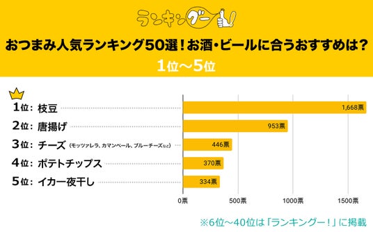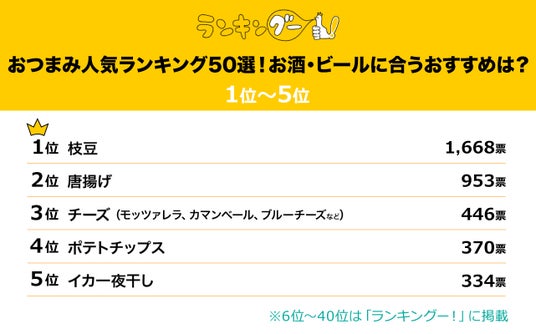 大差で1位を獲得した『枝豆』に続き、2位には『唐揚げ』がランクイン。3位は『チーズ』、4位は『ポテトチップス』、5位は『イカ一夜干し』といった、家に常備しておきたい、お酒に欠かせない最強のおつまみが後に続く結果となりました!