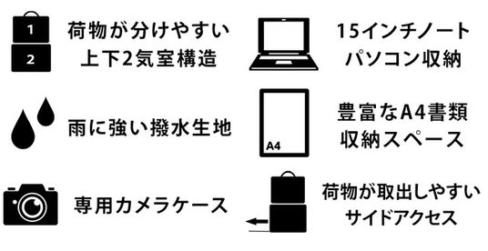 カメラバッグブランドEnduranceで培った上下2部屋に分かれたバッグ構造をビジネスリュックに取り入れたビジネスリュックとして