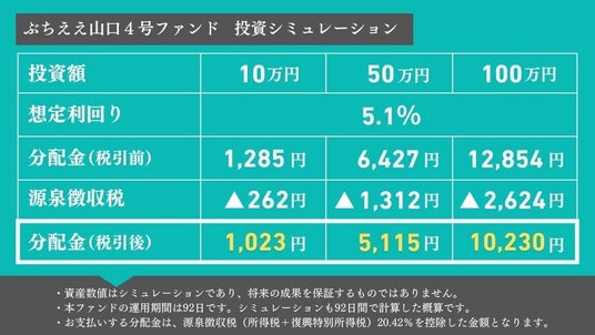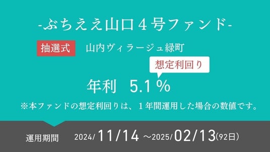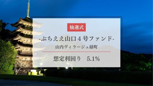 株式会社田村ビルズ(本社: 山口県山口市黒川 代表:田村 伊幸)が提供する田村ビルズクラウドファンディングの不動産小口化商品「ぶちええ山口4号ファンド」を抽選式で本日10月21日(月)より募集開始いたしました。本ファンドの投資対象は山口県山口市緑町にある分譲マンションです。対象不動産はすでに弊社が所有し、安定した賃貸運営をしています。その賃料収入を配当資源として投資家の皆さまへ分配する予定です。