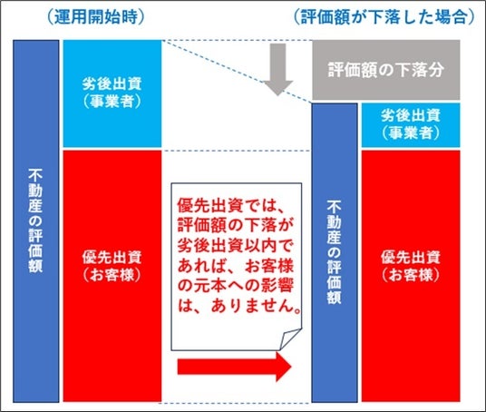物件の運用期間中や売却時に損失が発生した場合は、劣後出資額までの損失は「優先劣後システム」により劣後出資者である株式会社田村ビルズが負担し、投資家さまの出資元本の安全性を優先的に守ります。